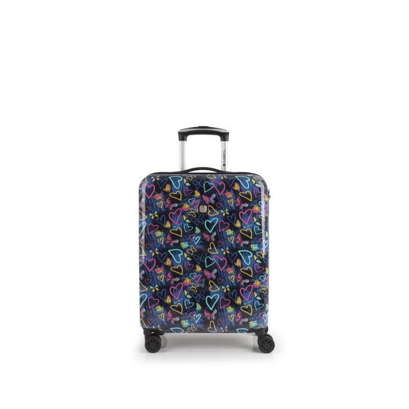 Fenomenalan kabinski kofer od ABS-materijala, sa četiri dupla točkića. Unutrašnjost ima separatore, sa rajsferšlusom i strap trakom. Kvalitetna teleskopska ručka. Dizajniran kombinacijom srca, leptirića i raznolikih šara.