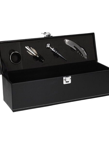 рсд 2.390,00Set za vino, drvena kutija za vinsku flašu obložena eko-kožom, 4 elementa: višenamenski vadičep, zatvarač za flaše, umetak za sipanje vina, prsten protiv prolivanja vina, dimenzije: 35,5x10x12cm