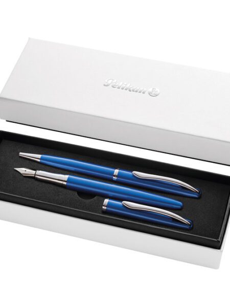 set sadrži naliv pero I hemijsku olovku; hemijska olovka sa plavim ispisom, twist (okretnim) mehanizmom, dimenzije: 140x10,5mm, težina: 25g; naliv pero sa srednjim perom od nerđajućeg čelika, patrona sa plavim mastilom (konvertor za upotrebu mastila iz bočice se kupuje zasebno), dimenzije: 145x11mm, težina: 24g; u poklon kutiji G25; garancija 3 godine