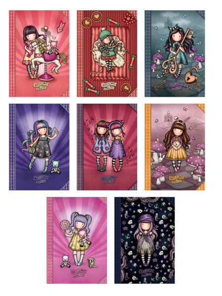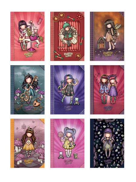 Sveska tvrdi povez A5 linije Gorjuss, mat plastificirane i lakirane korice sa glitterom; 80 + 4 lista sa rasporedom časova; 70 g/m2; 9 motiva