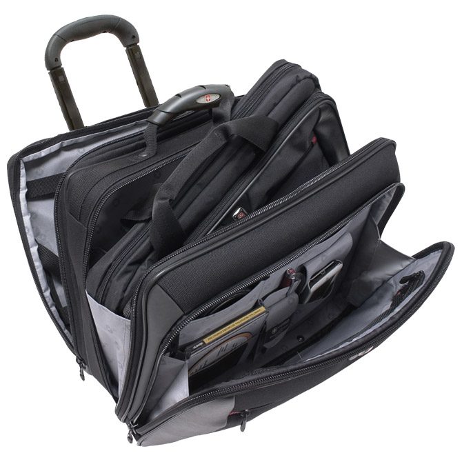 za 17″ laptop; teleskopska ergonomska ručka i ručka za nošenje; sadrži: dodatnu laganiju torbu; brojne pregrade za lakše snalaženje i višenamenske pregrade; zip na zaključavanje; dimenzije: 44x42x25 cm