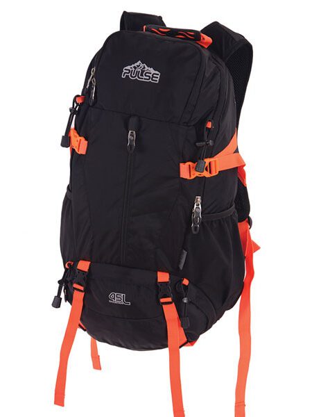 Ranac Pulse Mountain 45L, dimenzije: 30 x 53 x 17cm, 1,08kg, za planinarenje, kampovanje i putovanja KUPOVINA ISKLJUČIVO ONLINE, UZ MOGUĆNOST PREUZIMANJA I PLAĆANJA U RADNJI. Ovaj ranac je namenjen avanturistima. Pored kvalitetne izrade, vodoodbojnog materijala, u rancu se nalazi mnoštvo pregrada, specijalnih džepova za osetljive predmete. Spolja se nalazi držač za štapove, kacigu ili loptu. Idealan za višednevne šetnje koje zahtevaju velika opterećenja i puno dodatne opreme. Dodatak čini aluminijumska konstrukcija radi što boljeg prijanjanja ranca uz leđa i specijalni otvor za vodu da uz pomoć cevčice ne morate vaditi bocu iz ranca. Bezbednost je na najvišem nivou čak i u najtežim vremenskim uslovima zbog fluorescentne kabanice koja omogućuje bolju uočljivost i zaštitu. Zapremina ranca je 45L